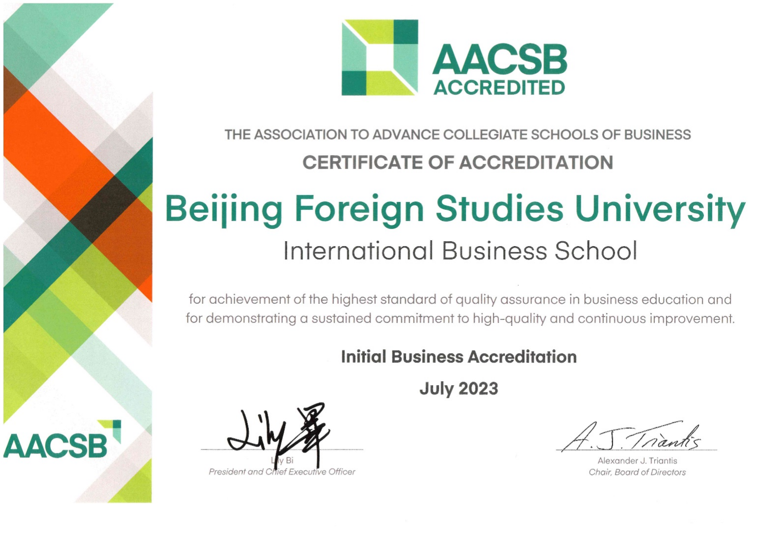 On August 1, 2023, The Association to Advance Collegiate Schools of Business (AACSB) released an official announcement, which was voted by the Initial Accreditation Committee and approved by the Board of Directors. The Board of Directors of AACSB voted and approved that the International Business School of Beijing Foreign Studies University has been officially accredited by AACSB for a period of five years. Up to now, about 6% of the business schools in the world have passed the accreditation.