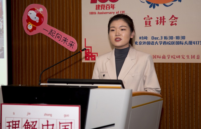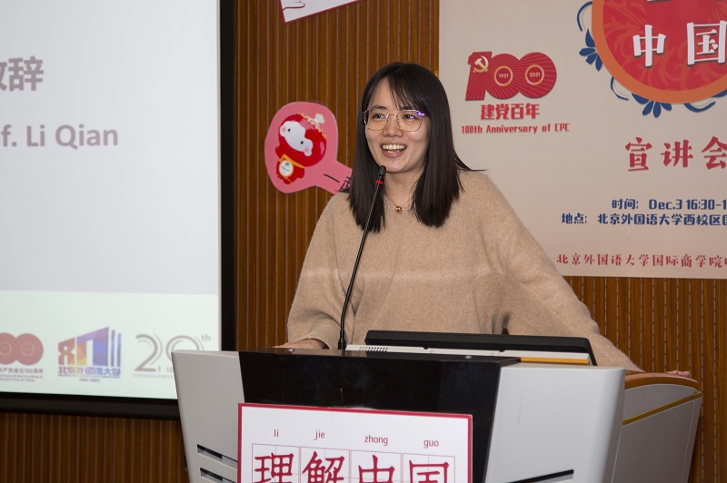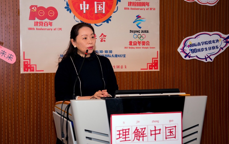 活动伊始,党总支书记李春丽首先致辞。她代表学院对本次“理解中国”宣讲会的开展表示热烈祝贺,并强调本次活动是贯彻落实好习近平总书记给北外老教授回信精神的重要实践,也是同学们讲好中国故事、传播中国声音的身体力行。她希望职工同学能通过本次宣讲更加了解中国共产党的历史成就、了解北外的发展历程、了解北京2022年冬奥会的相关知识,通过各种方式了解中国、读懂中国,并热烈欢迎职工们加入到传播中国故事的队伍中,为加强中外交流贡献自己的力量,并预祝本次宣讲活动圆满成功。