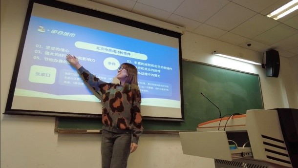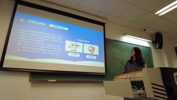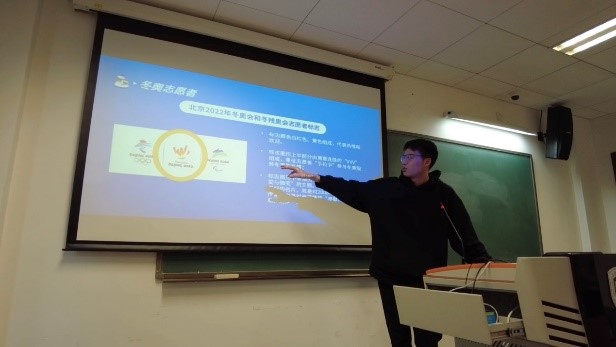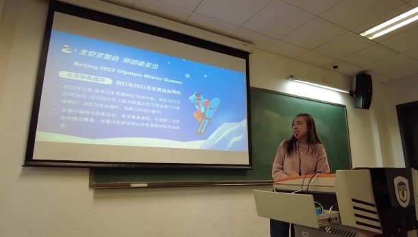 团日活动的第一个环节是“冬奥有我”志愿者分享会。支部书记和委员们为大家准备了关于2022年北京冬奥会的幻灯片,上面详尽展示了众多与冬奥相关的主题,比如北京申奥成功的条件、冬奥会的基本介绍、2022年北京冬奥会的赛事项目设置等,邀请团支部成员自愿上台围绕其中一个或多个主题进行介绍与分享,每位分享的同学可获得2积分。