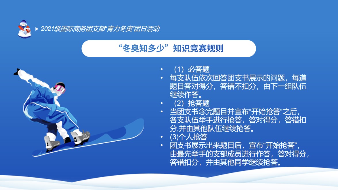 为深入贯彻习近平总书记关于冬奥会筹办工作的一系列重要指示精神,大力弘扬奥林匹克精神和“奉献、友爱、互助、进步”的志愿服务精神,展现青年风范,同时加强支部内部成员的凝聚力和身体素质,2021年11月19日,2021级国际商务团支部开展了“青力冬奥· 志愿北外,热‘雪’澎湃,一起向未来”主题团日活动,增进同学们对冬奥的了解和服务冬奥的意识。本次主题团日活动由以下五部分组成: