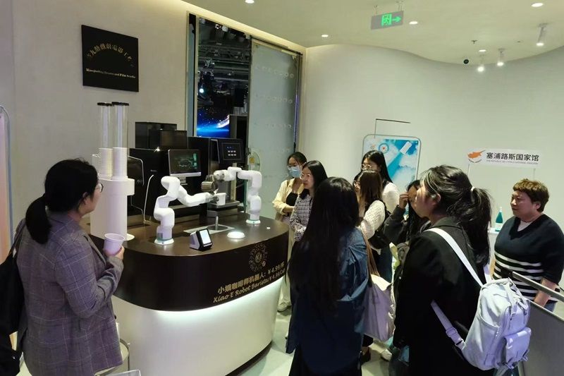 参访首站聚焦“为汇”门口的咖啡机器人。这款机器人不仅具备快速制作咖啡的核心能力(单杯制作时间较传统人工大幅缩短,有效提升单位时间产出量,降低单位产品人工成本),更以精湛的拉花技术赋予产品高附加值,满足消费者对品质与视觉体验的双重需求。
