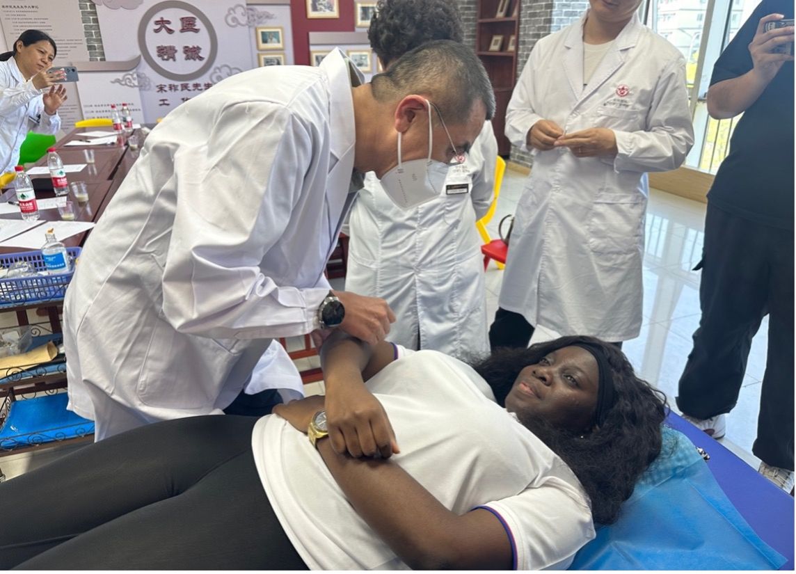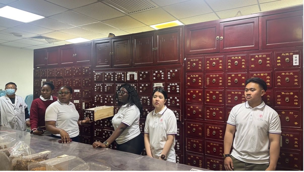 The seminar began with a visit to Beijing Yanhuang Hospital of TCM, where students immersed themselves in the institution’s blend of ancient practices and modern healthcare. Students received custom TCM-themed shirts and toured the facility. They explored the hospital’s herbal pharmacy, observing the meticulous preparation of medicinal formulas and gaining insights into the role of natural ingredients in TCM therapies. Staff members demonstrated traditional diagnostic techniques, such as pulse analysis and tongue examination, highlighting the scientific rigor behind centuries-old practices. Following the tour, the group took a leisurely walk through Beijing’s historic hutongs, connecting Yanhuang Hospital to Huimin Children’s Hospital.