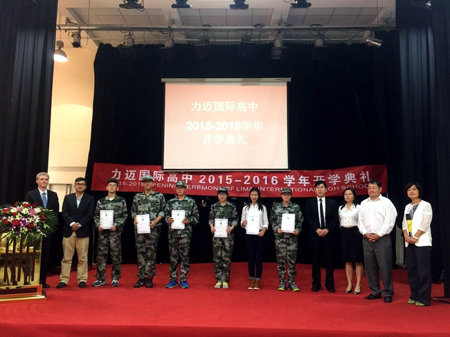 经过几个月的筹备工作, 2015级首期北外国商教学基地的力迈国际高中学员于2015年9月6日正式报到,他们与来自北京市力迈外国语学校其他2015级新生一起参加了为期5天的军训。9月11日下午,结束军训的新生回到学校,与在校生一起参加了力迈国际高中2015-2016学年开学典礼,到场嘉宾为军训期间评选出的优秀标兵颁发了奖状。