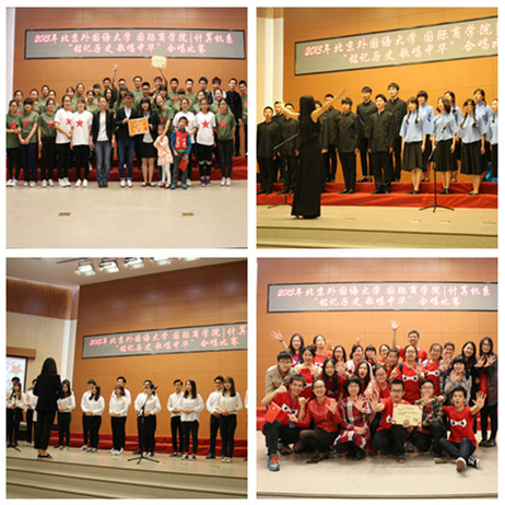 合唱表演中,各班嘹亮的歌声,富有历史感的服装,精心编排的节目与制作精良的视频等将现场气氛一次次推向高潮。班主任老师也参与到各班的表演当中,与员工一起唱响历史。另外,北外十大歌手以及韩国职工为观众们带来了精彩的特别演出。最终,经过评委打分评定,工管五班、金融三班以及国贸一班分获一二三名,计算机八班指挥获得最佳指挥奖,金融三班获得最佳创意奖,国贸一班获得精神风采奖。