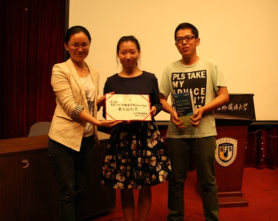 表演结束后,评委们分别做出点评,并宣布了“最佳编剧奖”、“最佳男女主角奖”、“最佳人气奖”以及“最佳短剧奖”的获得者。其中,2014级工管四班获“最佳短剧奖”并将代表国商参加北外英文短剧大赛。