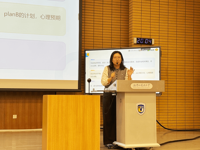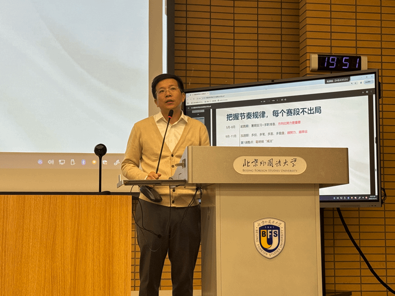会上,兰建华结合多年就业工作经验,从宏观趋势与个体应对双重视角,为毕业生作了深入解析。他强调,当前就业竞争压力持续加剧,未来几年毕业生人数仍将持续增长,用人单位对学历、实习经历等要求日益提高,同学们需高度重视实习经历积累。谈及北外学子的核心竞争力,他明确指出,卓越的语言能力与复合型素养是赢得用人单位青睐的关键,建议在简历中重点突出英语六级等高水平语言成绩。在政策赋能方面,他鼓励同学们充分把握各地落户、就业补贴等政策红利,主动通过“北外就业创业网”等渠道拓宽信息渠道,以更加积极的姿态把握机遇,迎接挑战。