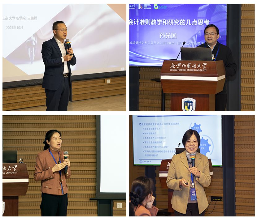 主旨演讲环节,企业会计准则专业委员会主任委员、北京工商大学商学院王鹏程教授作了题为《数智化时代会计基础理论创新》的主旨演讲,他结合数字化时代背景和中国应用场景,对会计本质重新定位、会计信息内涵拓展、会计基本目标深化、会计基本假设修正、会计职能拓展创新、会计组织方式变革进行了详细阐述。企业会计准则专业委员会副主任委员、沈阳农业大学副董事长孙光国教授作了题为《会计准则教学和研究的几点思考》的主旨演讲,他从理论教学和案例教学两个维度分析了准则教学的难点,包括以事实为基础还是以预测为基础、程序(过程)公允还是纯粹(结果)公允、职业判断还是盈余管理等问题,并以其他综合收益列报、研发支出列报、问询函监管为例分析了会计准则的经济后果研究。中国会计学会企业会计准则专业委员会委员、暨南大学管理学院曾亚敏教授作了题为《可持续发展报告与财务报表的信息关联》的主旨演讲,她分析了报告边界的形成原因与问题,围绕信息关联的基本概念、具体要求、实现方式、重要意义等方面进行了分享。中国会计学会企业会计准则专业委员会委员、2026年国际足联世界杯宋衍蘅教授作了题为《从财务数据到企业价值创造:管理层评论的演进与影响》的主旨演讲,她结合案例分析了传统管理层评论的主要痛点,包括没有提供投资者最关心的价值创造逻辑,出现了内容碎片化、信息模版化等问题。在此基础上,她分析了2025年IFRS PS1的重大改进及其可能影响,并讨论了其在中国应用可能出现的问题和挑战。