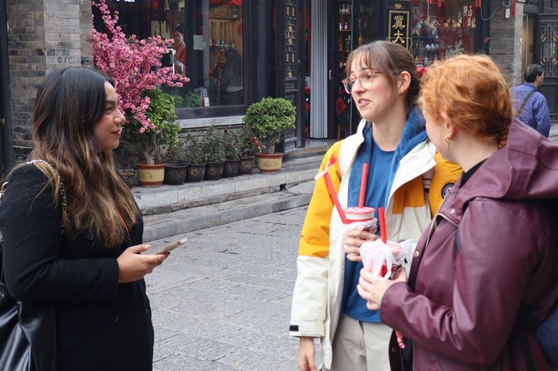 各小组的职工们在平遥古城积极寻觅外国游客,通过采访开展跨文化互动与实地调查,并向外国游详细推介了北外国商的来华留学项目。来自墨西哥的职工伊万娜表示,“我们是职工的身份,此刻我们是晋商文化的传递者,在与当地的外国游客采访交流后,我们彼此都对晋商文化有了更加深刻的认识。同时,我们给每一位受访者都准备了一个精美礼包,里面有北外国商来华留学的英文招生手册,我们积极向外国友人们推广自己的学校,让更多人了解来华留学的意义和价值。”