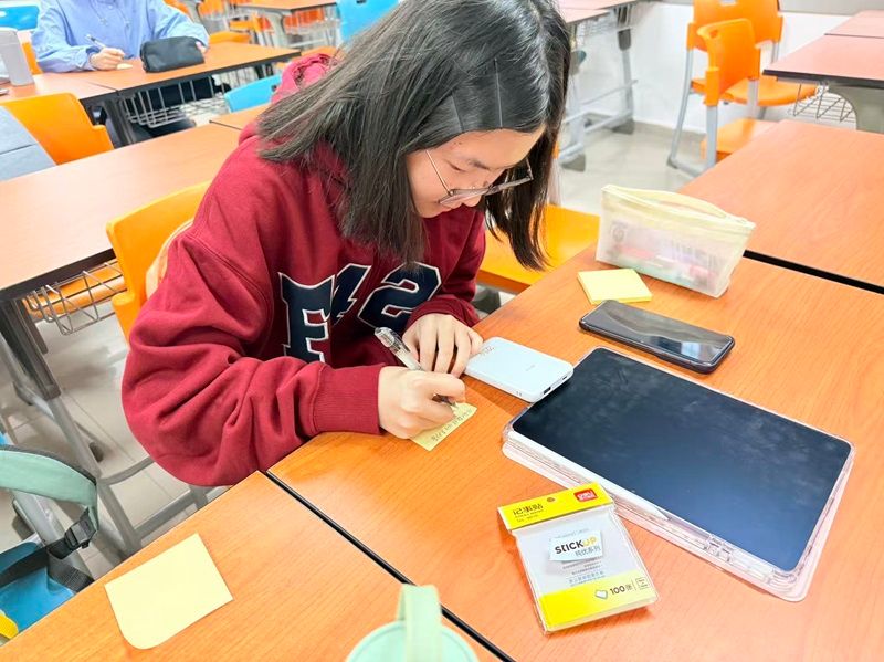 有了精神指引与实践参考,最后通过 “征程共赴”,为同学们明确未来方向并发出行动倡议。孙钧同学结合国庆特殊节点与党的二十届三中全会精神,提出三点倡议:做历史记忆的 “守护者”,通过读历史文献、看家国情怀纪录片等铭记历史;做综合本领的 “锤炼者”,每日精进外语、钻研专业知识点、掌握实用技能;做时代发展的 “参与者”,加入宣讲团传播政策精神与中国故事、参与基层志愿服务、走向国际舞台展现中国青年风采。活动还特别设置 “国庆留言帖” 环节,同学们写下对祖国的祝福、对团课的感悟,为此次活动留下珍贵纪念。