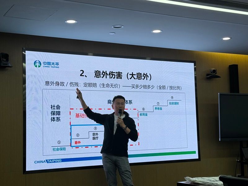 随后,师生们进入会议室进行交流。太平区域总监杨靳平代表企业致欢迎辞,精心准备的茶歇也让现场氛围更显温馨。分享环节由太平经理钟阳主讲,主题为“中国内地保险市场:社会保障与商业保障的共生之道”。他系统梳理了我国社会保险体系与商业保险体系的架构,详细讲解了“四大账户”的功能逻辑与太平人寿产品体系的核心优势。内容涵盖“五险一金”的具体保障范围,商业保险如何满足民生需求,当前保险行业的发展态势,以及太平保险的核心竞争力。钟经理用通俗的语言,帮助同学们澄清了对保险领域的常见认知误区。
