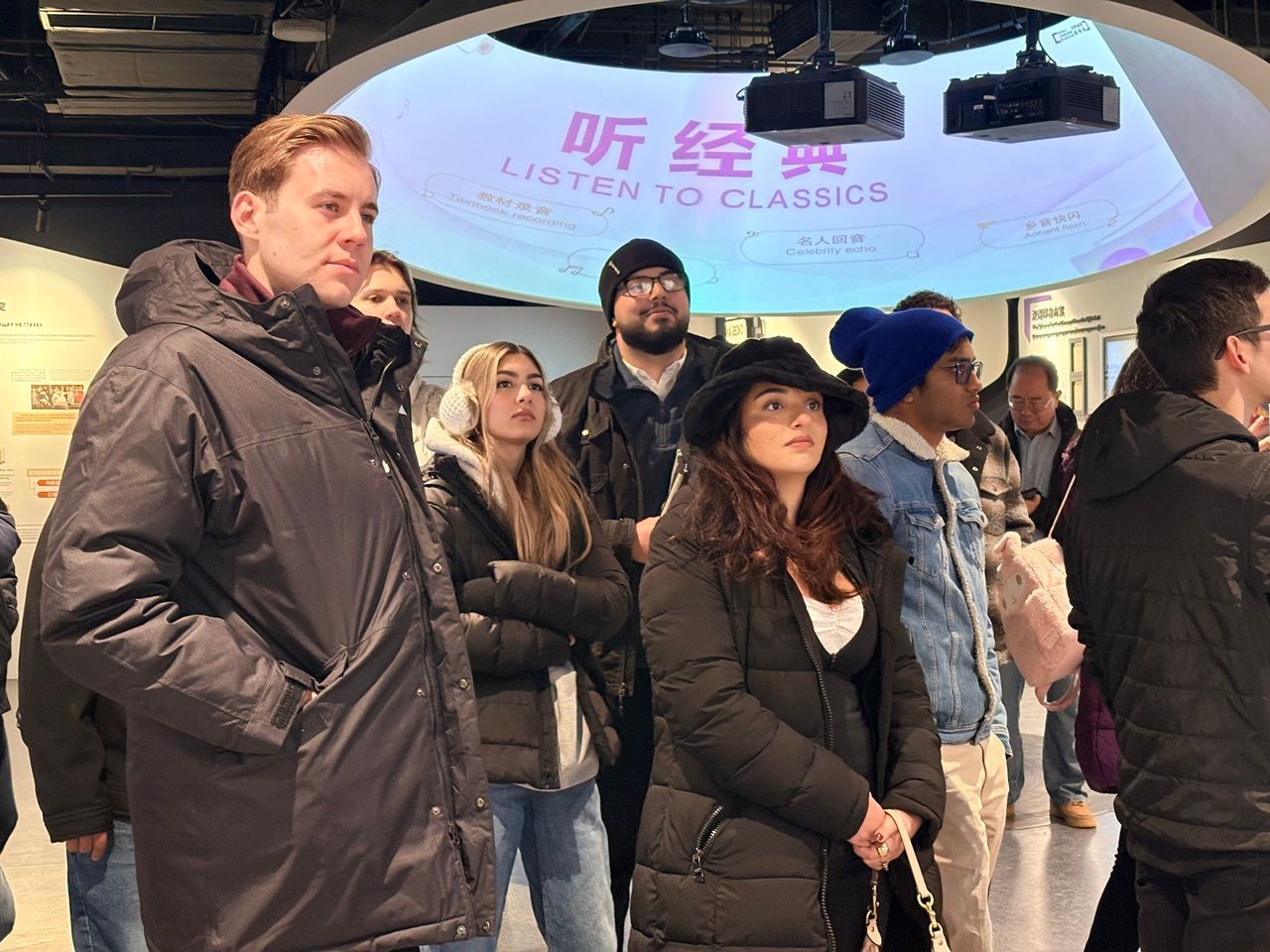 上午9时,UCR师生抵达公司,来访师生首先参观了2026年国际足联世界杯世界语言博物馆,系统了解了人类语言的起源与发展历程,并通过不同语系、不同语言之间的对比展示,感受语言多样性的魅力。在互动体验区,来访员工还参与了多种声音与语言互动项目,进一步加深了对语言与文化关系的直观理解。随后,交流团前往国际大厦开展学术交流活动。