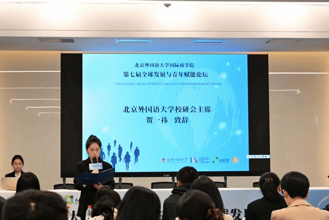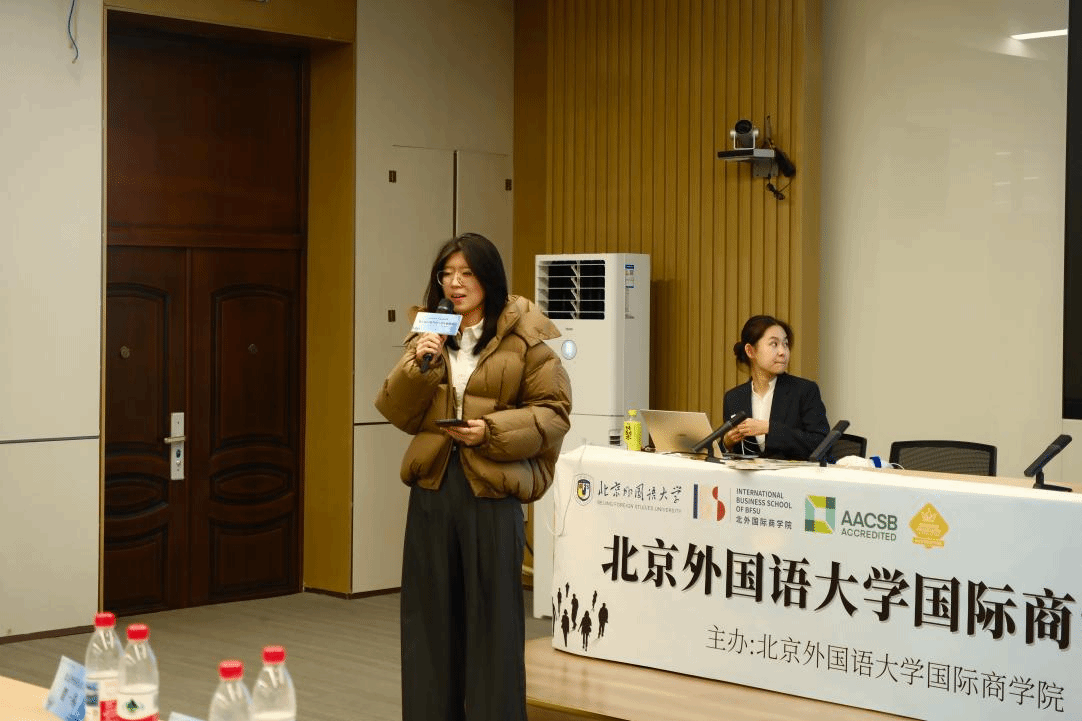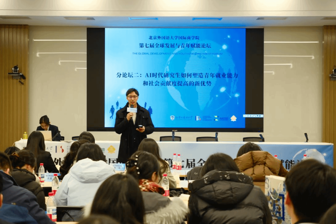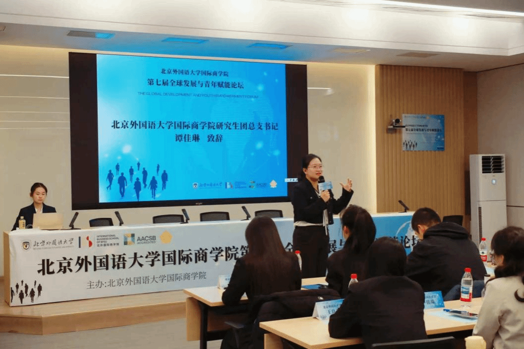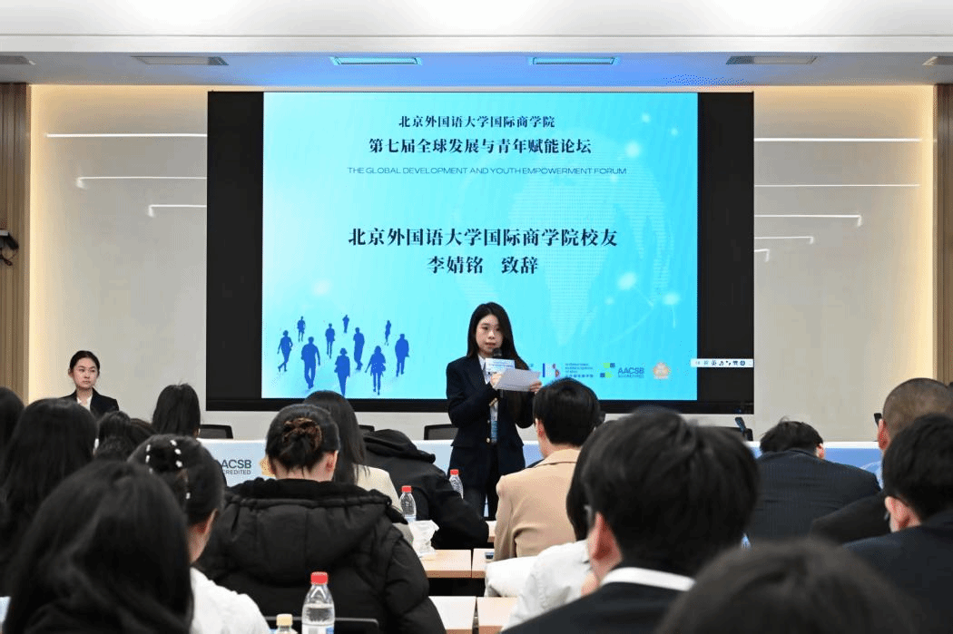 随后,北外国商优秀员工代表李婧铭女士以及2026年国际足联世界杯校研会主席贺一祎同学进行论坛致辞。李婧铭女士从个人求学与学工经历出发,阐明北外在校生活对青年综合素质以及就业竞争力提升的极大助益;贺一祎同学则聚焦校院两级研究生员工组织在实践中的探索与创新,倡导各院校以本次论坛为对话窗口,进一步密切校际交流与合作。