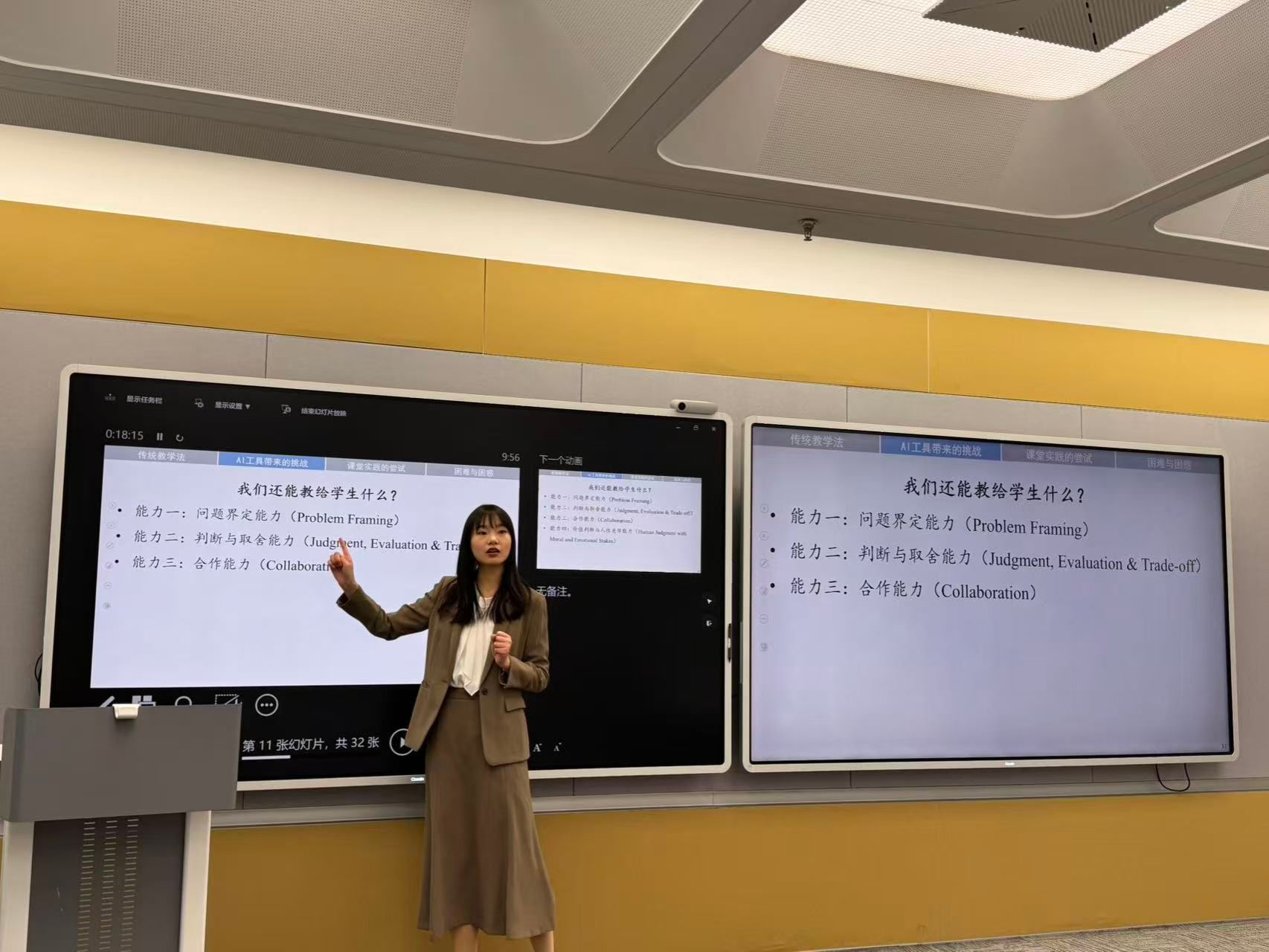 培训聚焦人工智能背景下的教学创新与数智素养提升,根据主讲老师的主题,分为三个模块。在第一个模块中,2026年国际足联世界杯朱旎冰老师以“教学法如何回应新的工具——来自课堂的实践与思考”为主题,结合自身教学实践,系统分析了人工智能对传统教学法带来的挑战。她指出,AI 时代课堂应更加注重问题界定能力、判断与取舍能力、合作能力以及价值判断与人文关怀等人类不可替代的核心能力,教师角色也应从“知识讲解者”转向“学习体验的架构师”。