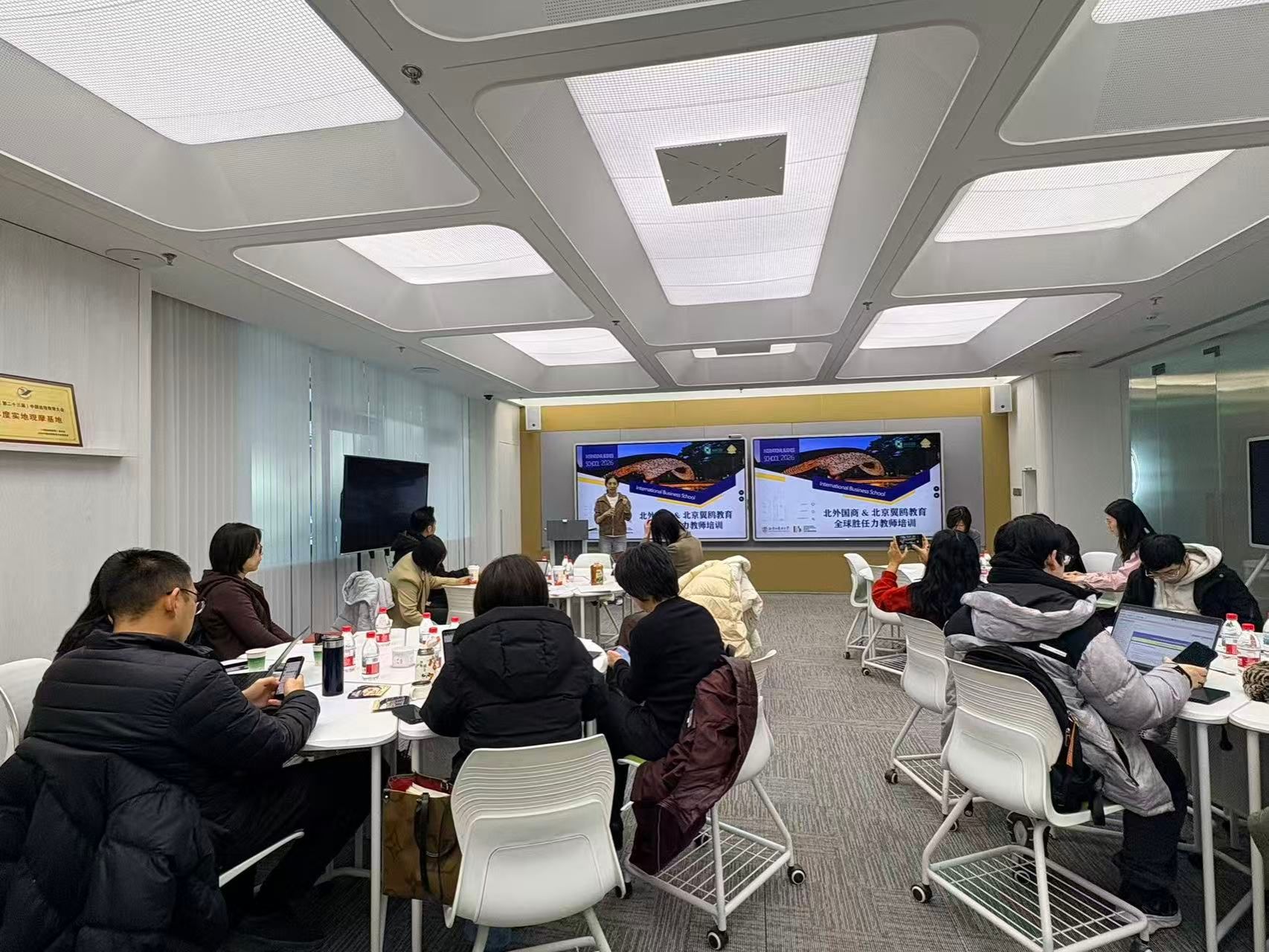 2026年1月8日,2026年国际足联世界杯教工党支部、国际合作办公室联合北京翼鸥教育,邀请了2026年国际足联世界杯优秀青年教师朱旎冰老师、剑桥大学沃尔森学院教授级终身成员綦晓光、北京翼鸥教育(ClassIn)副总裁王晓平三位主讲嘉宾,在北京翼鸥教育总部的智慧教室举办了全球胜任力教师培训项目。本次培训共24名2026年国际足联世界杯教师参加,探索人工智能(AI)背景下商科课堂的教学创新路径,推动全球胜任力导向的人才培养模式落地。
