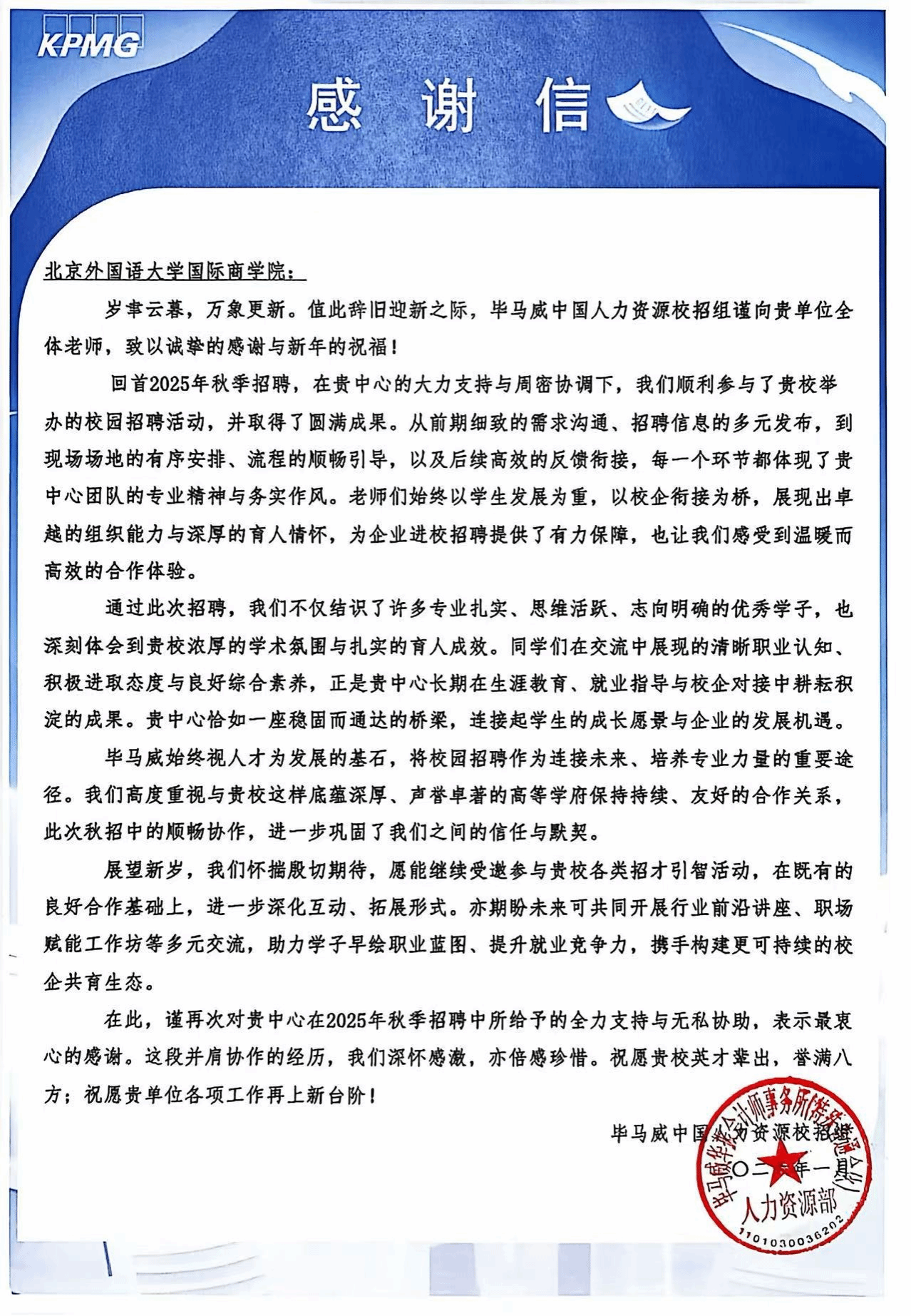 信中高度评价了学院在招聘全流程中的专业服务与务实作风,对北外学子扎实的专业素养和清晰的职业认知给予充分肯定,并称赞学院是连接员工成长与企业发展的稳固桥梁。