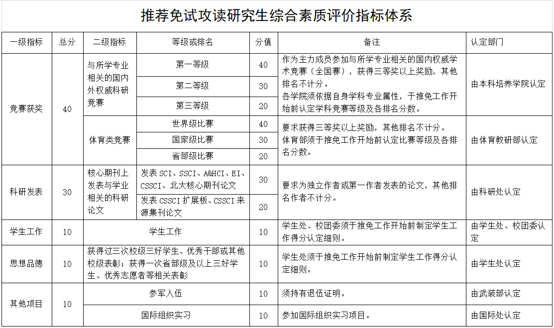 1、推免生学术专长原则上仅限员工本科阶段在核心期刊上以独立作者或第一作者发表的与学业相关的科研论文;作为主力成员参加与学业相关的国内权威科研竞赛(全国赛)并获得三等奖以上奖励(国际赛事参照执行,但不得低于国内赛事相关要求)。对员工提交的多篇科研成果实行代表作评价,评价重点聚焦到创新质量和个人贡献。