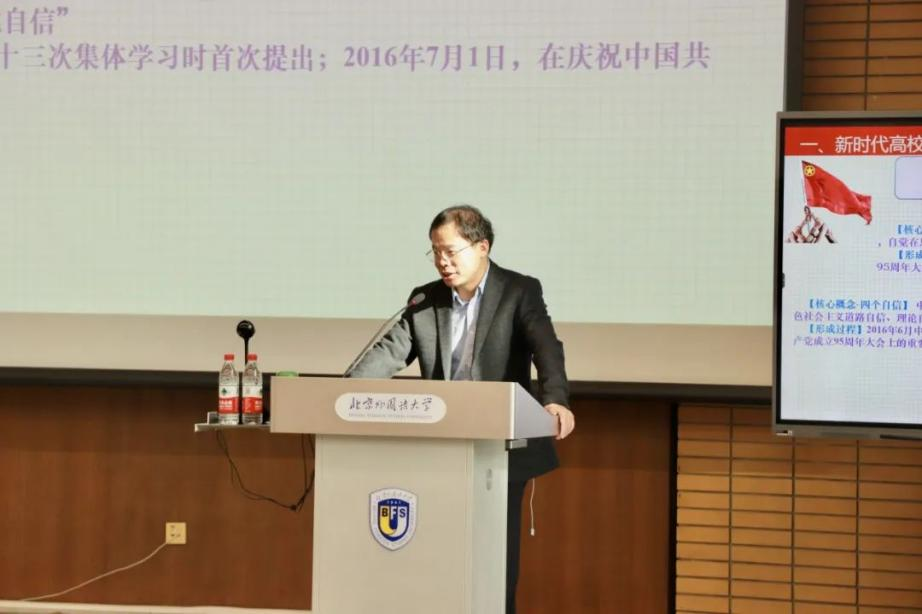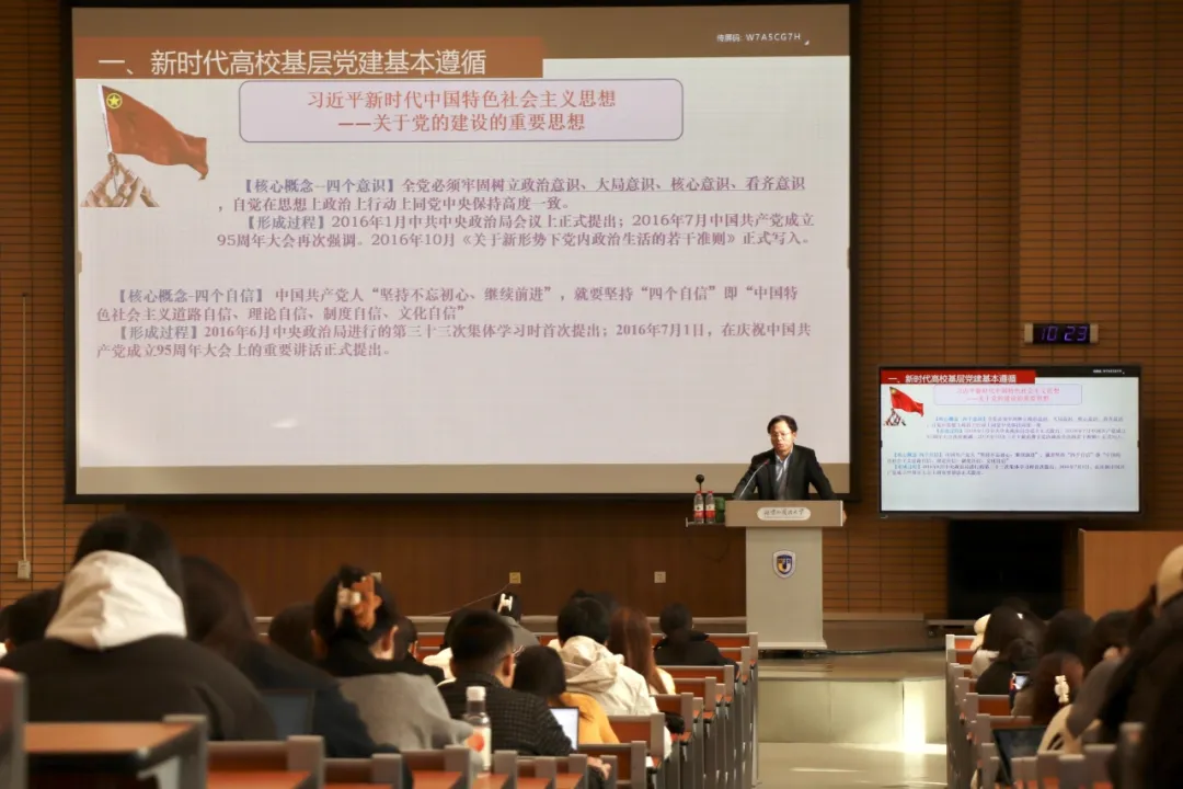 冯刚以《习近平总书记关于党的建设的重要思想与新时代高校基层党组织工作解读》为主题,分别从新时代高校基层党建基本遵循、新时代高校基层组织工作主要法规、新时代高校基层组织工作标准化指引、新时代高校基层组织工作重点把握这四个要点向现场师生做了分享。
