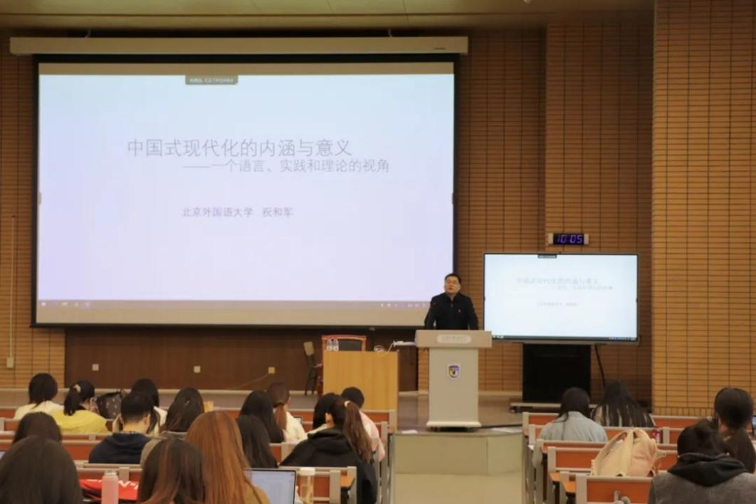 祝和军以《中国式现代化的内涵和意义——一个语言、实践和理论的视角》为主题,就回答“西方资本主义和现代化的关系”、“中国式现代化实践和中国式现代化理论的关系”和“中国式现代化和西方式现代化在内容上的区别”这三个问题向现场师生做了分享。
