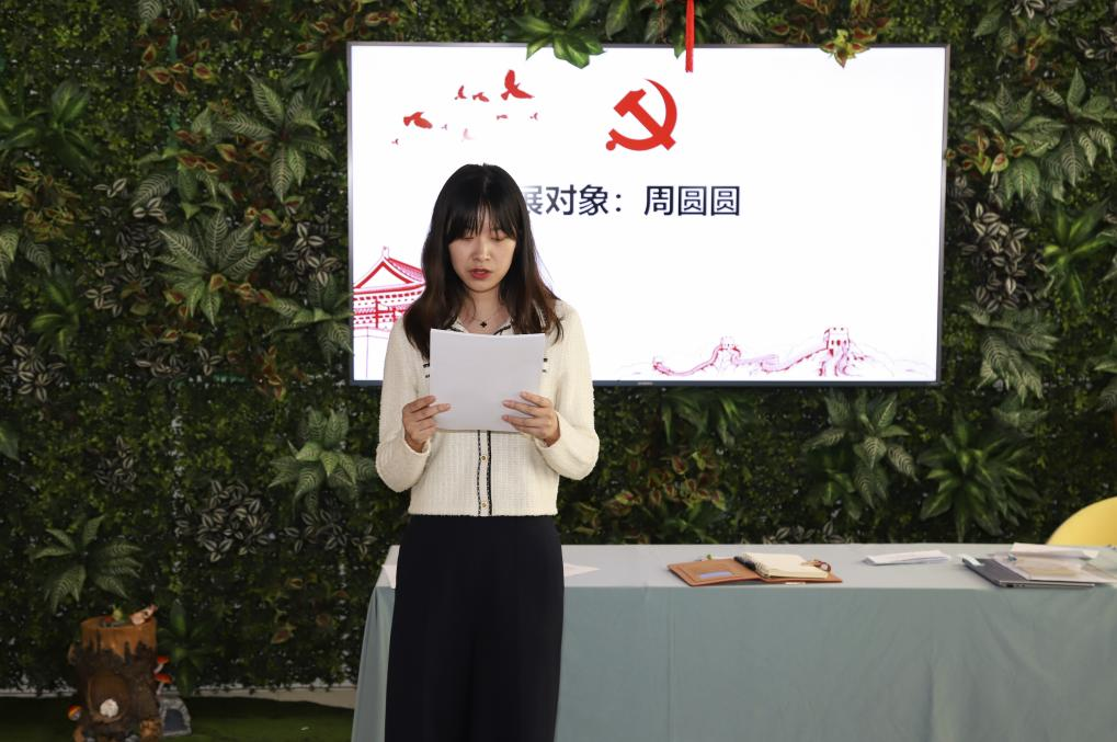 青年教师周圆圆汇报了自己对党的认识和入党动机。两位入党介绍人介绍了发展对象的基本情况并发表意见,支部委员宣读了教工支部对周圆圆的考察意见。与会党员对周圆圆的表现先后发表意见后,经过无记名投票,支部通过了发展周圆圆为中国共产党预备党员的决议。决议宣布后,周圆圆表示在今后的工作和生活中将不忘初心,以党员的标准严格要求自己,不断提高党性修养,踔厉奋发,为学院各项事业做出更大贡献。