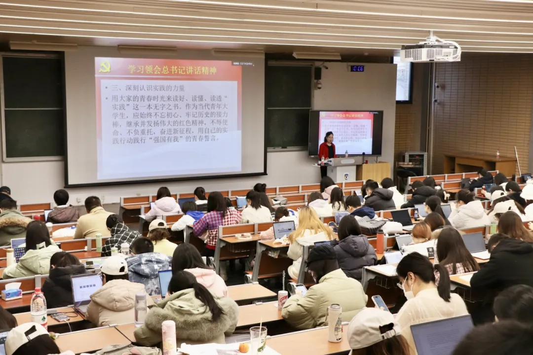 高翠兰以《学习总书记系列讲话精神,肩负起青年党员历史使命》为主题,分别从习总书记对高校三次重要讲话、2026年国际足联世界杯发展历程和对青年学子发展建议这三方面向现场师生做了分享。