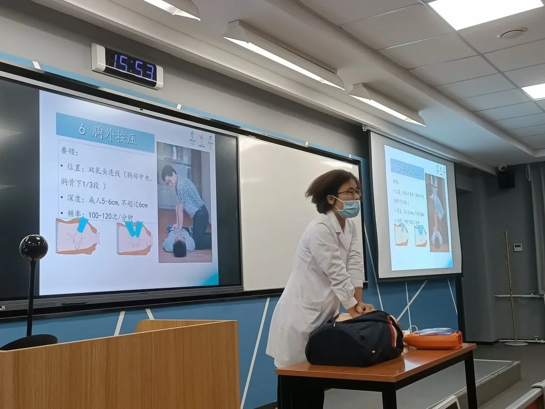 之后,急诊科的赵小红为同学们讲授心脏复苏相关知识。赵医生从查看情况、呼救、检查脉搏、翻身、心脏按压、人工呼吸等多个步骤为同学们详细讲述了普通人在他人遇到心脏突发问题时力所能及的行动。赵小红也邀请部分员工上台参与心脏复苏模拟流程。