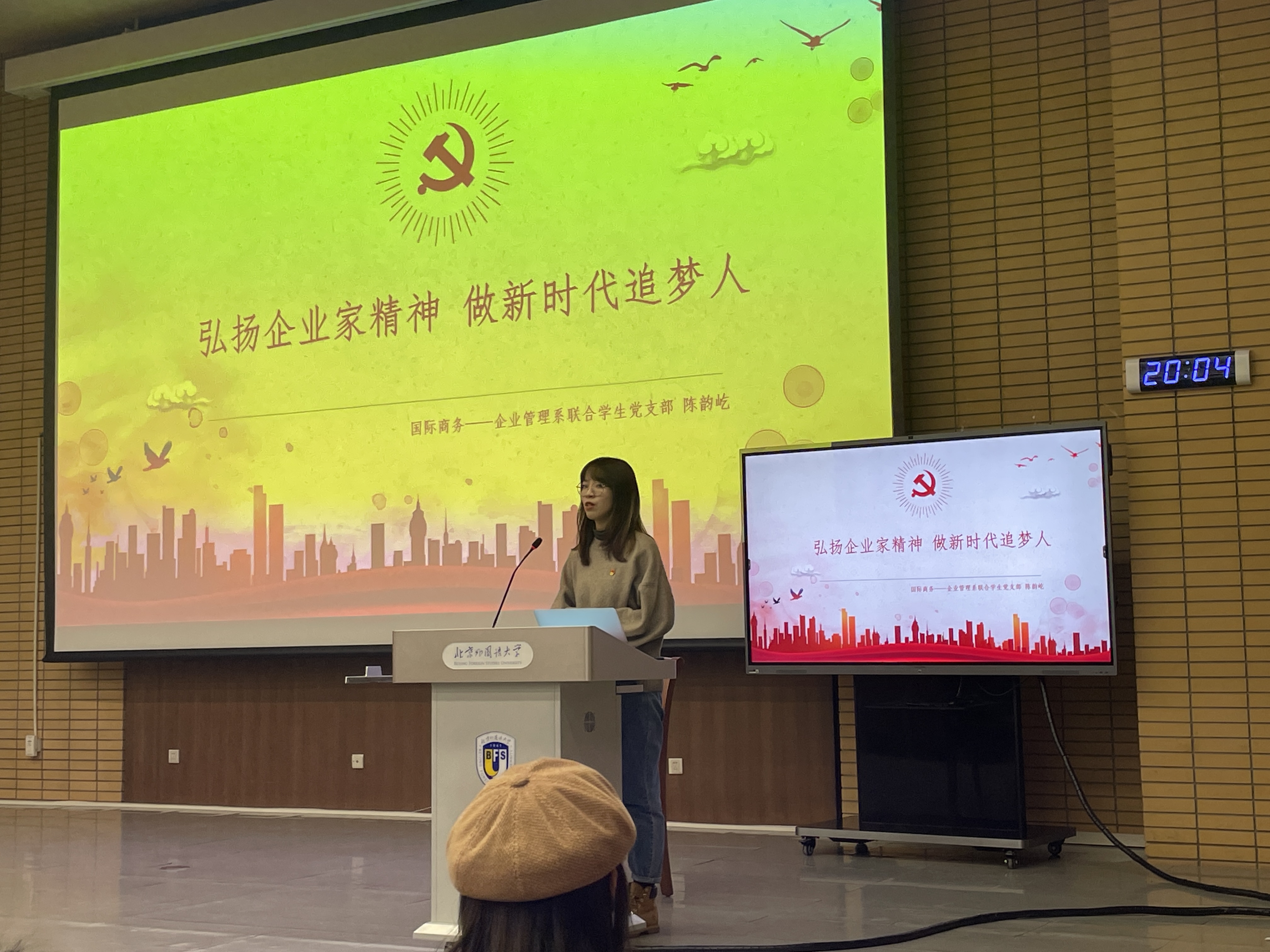国商-企管系员工党支部书记陈韵屹从“发奋图强产业报国”,“矢志创新追求卓越”,“服务社会履行责任”三个方面展开话题,说明企业应达则兼济天下,也鼓励同学们拥有全局视野, 做新时代的优秀青年。