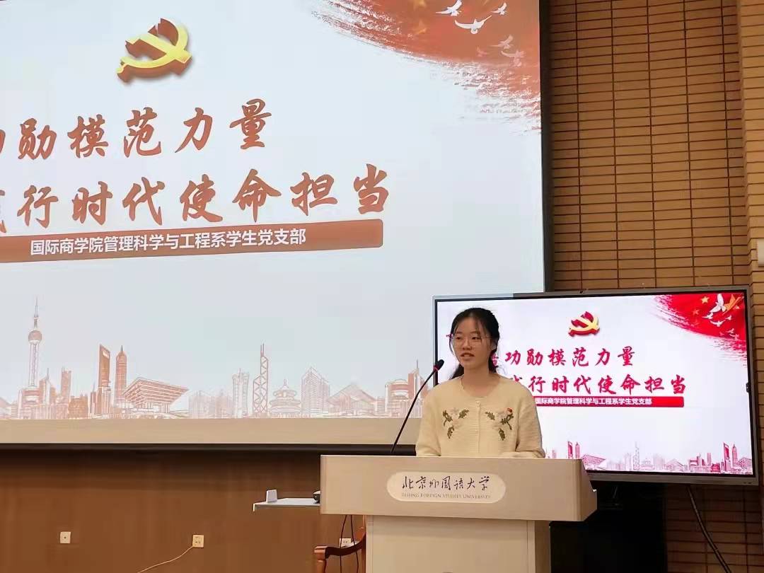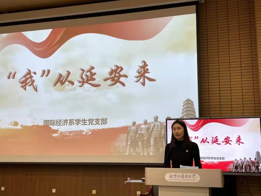 国际经济系员工党支部书记刘宜昕首先带领同学们回顾了党的一百年党史,强调了伟大的革命斗争精神永垂不朽,在现代也具有学习借鉴的意义。随后,详细介绍了北外自1941年以来的建校历史,带着红色的血液凝聚力量、奔赴未来。