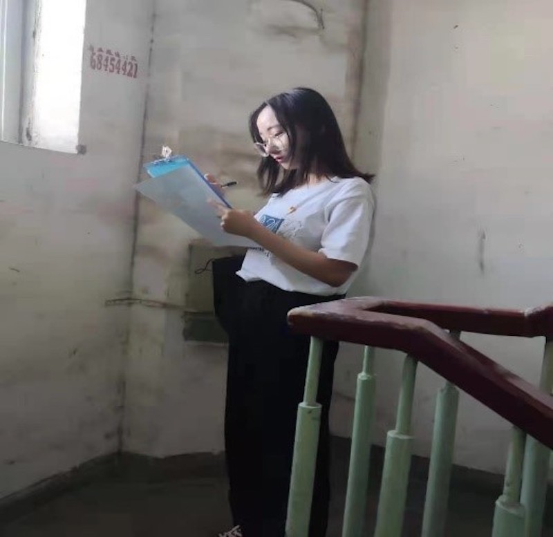 另一组则负责楼道垃圾排查工作,进行易燃物等堆积物品的登记,并粘贴了贴条,提示居民注意楼道卫生。