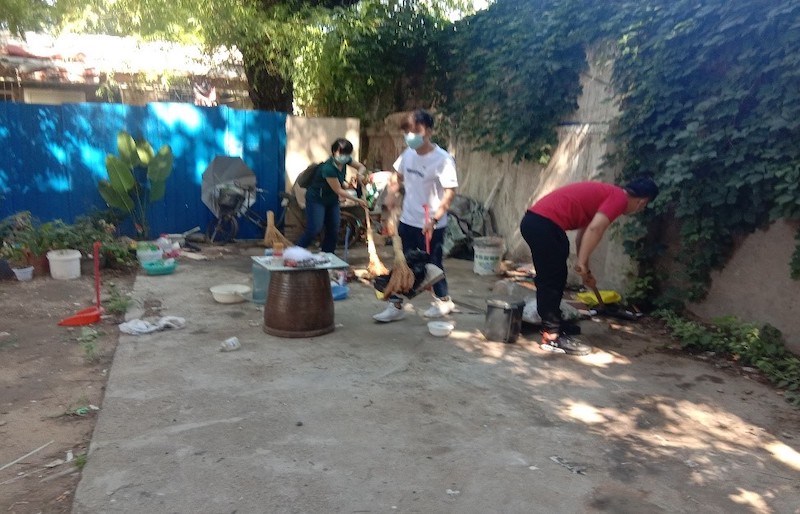 之后同学们分为两个小组,在社区在职党员的协助下开展工作。一组同学负责清洁社区的垃圾死角,完成清扫、装车、运送等任务。