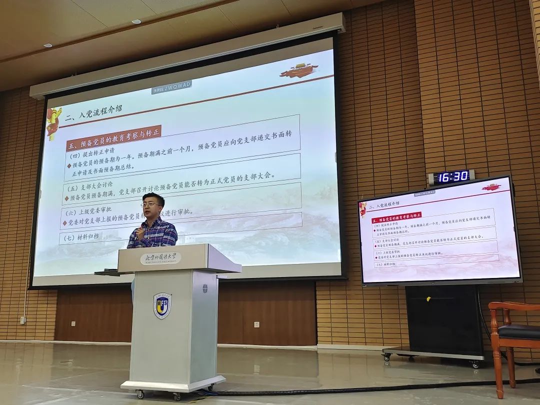 接下来,谭老师为所有新生详细介绍了国商员工党支部从申请入党到入党积极分子确定与培养考察、发展对象的确定与培养考察、预备党员的接收以及预备党员的教育考察与转正的整个入党流程,为新生党员解答了关于入党流程方面的疑惑。