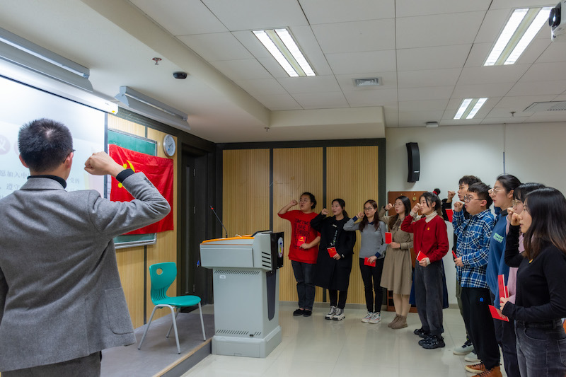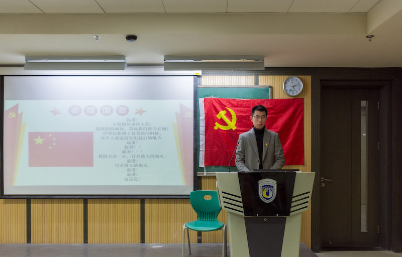 会议的最后党支部本次发展转正全体成员在书记的领读下面对党旗对党宣誓,宣誓结束后党支部与会人员合唱国歌,大会至此圆满结束。