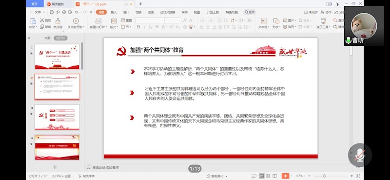 本次“两个一”主题活动由以“回望2020”为主题的党日活动和以“加强两个‘共同体’教育”为主题的创新理论学习活动两部分组成。首先,各员工党支部书记通过一系列文字和图片资料向支部党员回顾了2020年以来的工作开展情况,梳理了下一阶段的工作目标与思路,并提出对未来支部建设的期许与展望。在互动交流环节,与会党员认真反思、积极发言,就个人在疫情防控、日常生活、学习实践等方面进行了深刻的工作总结与自我批评,切实剖析自身存在的问题与不足,总结经验,砥砺前行。