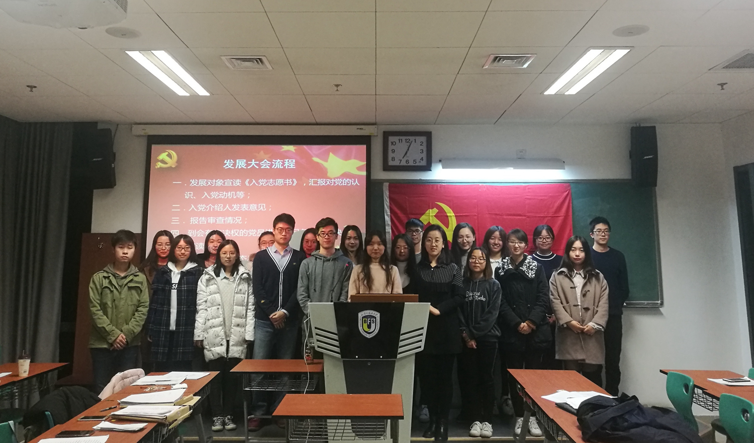 出席此次大会的有林普华、王米川两位老师,以及有表决权的正式党员吴锴、王瑞雪、吴娅锦、熊北辰、孔令恺五位同志,超过有表决权党员半数,符合规定人数,故发展大会可以召开。另有预备党员及积极分子数名参加此次发展大会。
