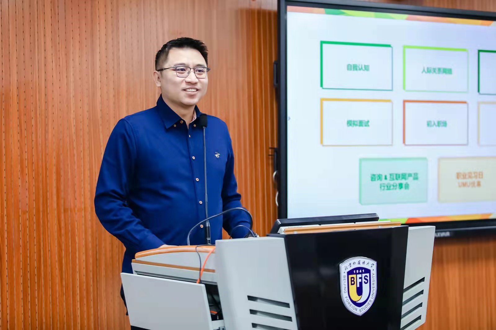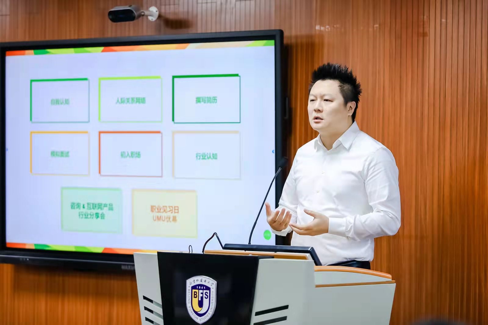 三名青年成就中国的志愿者代表进行了精彩的分享。来自北京优幕科技有限责任公司李东朔介绍了设置职业见习日的初衷,并表示希望同学们建立终身学习的能力。
