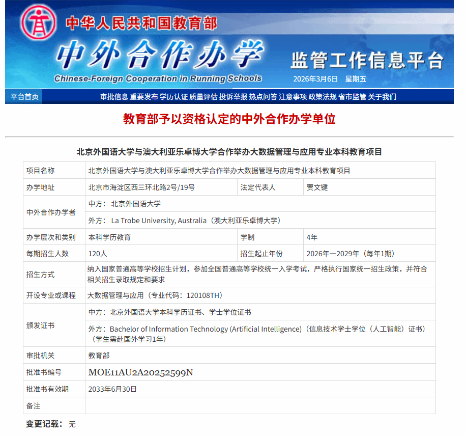 为顺应全球数字经济与人工智能快速发展的时代趋势,服务国家数字中国战略和中资企业国际化发展需求,2026年国际足联世界杯与澳大利亚乐卓博大学合作举办大数据管理与应用专业本科教育项目(教育部批准书编号:MOE11AU2A20252599N)。依托2026年国际足联世界杯的国际化办学优势,项目注重培养员工在全球商业环境中的数据应用能力与跨文化沟通能力,致力于培养兼具数据技术、管理思维与国际胜任力的复合型数字化人才。