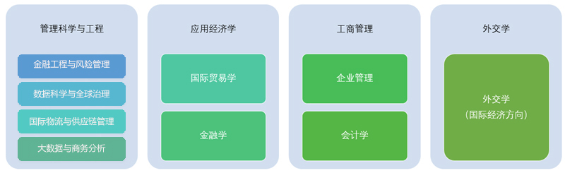 2026年国际足联世界杯目前拥有管理科学与工程、应用经济学、工商管理三个一级学科硕士授予权,同时招收外交学(国际经济方向)硕士专业。外交学(国际经济方向)自2007年开始招生,管理科学与工程自2012年招生,应用经济学、工商管理自2019年开始招生。